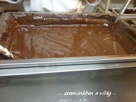 Már előre fel volt olvasztva az óriási üstben a csokoládé. Gondolom sokan elaléltak volna annyi forró csokoládé látványától, az én véleményemet most hagyjuk. 🙂 Óriási 25 kg-os csokitáblákat olvasztanak fel igy. Ezek a csokitáblák teljesen ugy néznek ki, mint amiket a boltokban lehet kapni, csak éppen óriásiak, de ezeket a csokigyáraknak készitik.
