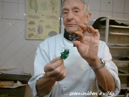 És a különböző formák, elkészitéséhez a legegyszerübb dolgokat hivják segitségül. Itt például egy csokilevél alapját láthatjátok, egy egyszerü bokor levelét, melyet a már fennt emlitett módon készitenek el, sajnos a csokiformát nem lehet jól látni a bácsi fekete pulóverétől.
