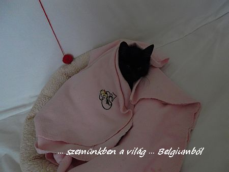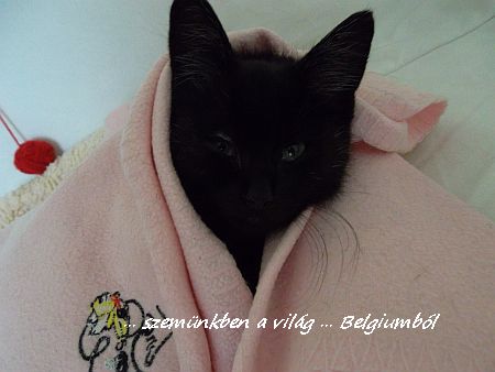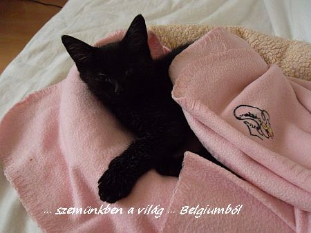 Betakargattuk a puha meleg takaróval, mert nem volt aki melegitse. Édesen belebujt, nem bánta, hogy betakargattuk, majd jólesően elkezdett dorombolni. Jó lesz itt neki, gondoljuk!