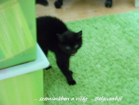 De ez mind sikerült is! Pár nap óta már közlekedik a lakásban ha bezárjuk a lépcsőház ajtajait és a kutyik nincsenek látható távolságban. Időnként be-behozzuk a nappaliba is, felderitette már a terepet rendesen, ha megijed a kutyiktól, akkor meg uzsgyi be a könyvek mögé, onnan pislog ki nagy szemekkel.