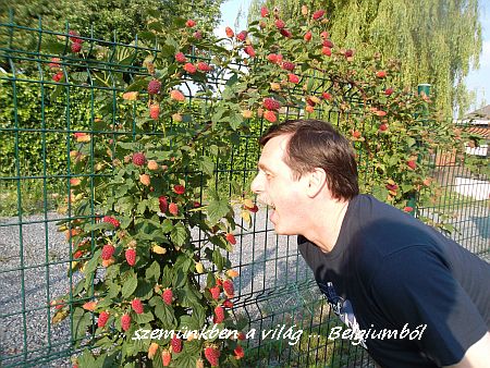 Bár itt pont egy nagy mackó falná fel az egészet, azért szépen látszik, milyen hosszu a bokor és mennyi termés van rajta. És milyen finom! Nagyon érdekes, mert nem olyan mint az otthoni málna, hanem a mérete, a formája inkább a szederéhez hasonló, de olyan finom zamatos málna ize van és annyira piros, hogy csak na!