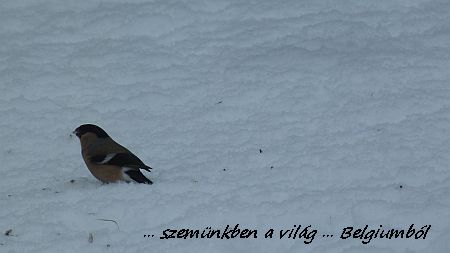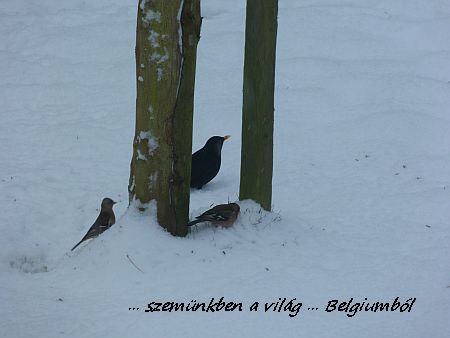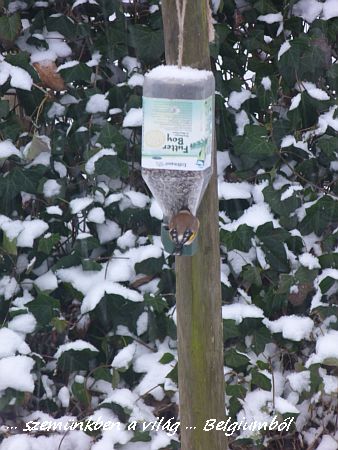 Eddig volt, hogy egy hétig sem kellett ujratölteni az etetőket, de napok óta csak sürüsödnek az uj kliensek, igy most már másfél nap és üresek az etetők. Most, hogy éjszaka megint esett a hó, jó nagy vihar is volt nálunk, reggel fél 8 óta pedig megállás nélkül csak esik, csak esik a hó, esélyük sincs, hogy találjanak kaját. Tegnap töltöttük fel Katinkával az etetőket, vannak kint faggyus magvaskarikák, hoztam németből egy darab szalonnát, azt is felvágtuk, kiakasztgattuk, csipkodják. Most már fogy a kiaggatott félbevágott alma is. Jól megfér a kis rigó is a sok apróság között: