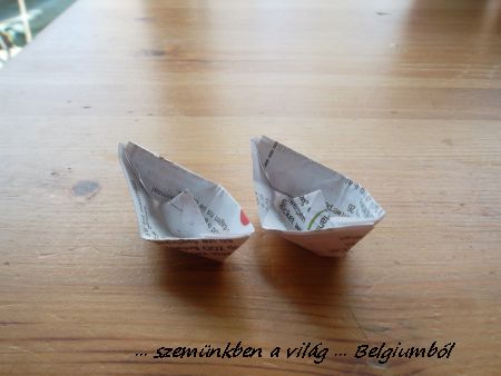 Bár az ilyenekhez nincs nagy kézügyességem, de alap dolgokat el tudtam késziteni nekik. Mint az elmaradhatatlan kishajók is. Egy apró papirból is hajtogattam nekik bárhol ha nem volt más játék a közelben. Tegnap beszélgettünk Gyuszival a konyhában. Volt ott két Delhaize-es számla. Közben észre sem vettem, hajtogattam: