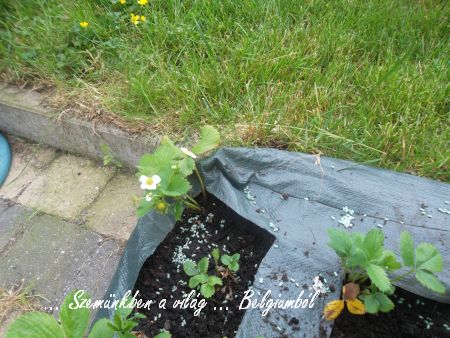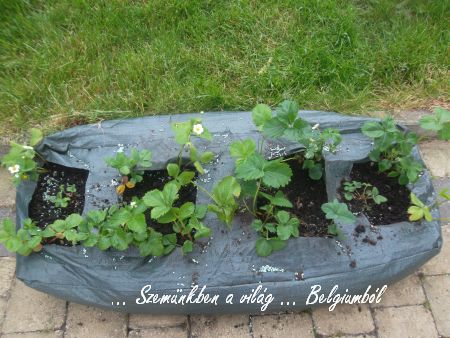 Timitől kaptam zsákokat, hogy tudjak ültetni paprikát, paradicsomot, meg mindenféle finomságokat. A zsákokra rá is volt írva hogy melyiket mihez ajánlják. Sajnos az elmúlt hónap betegeskedései miatt idén kimarad ez a kertészkedés. Viszont eszembe jutott a legnagyobb zsák, amit répának, káposztának ajánlottak. Mi lenne, ha inkább epret ültetnék bele? Gyuszi mondta, hogy próbáljuk meg. Vágott még rá két lyukat, hogy több palánta férjen bele és hétvégén meg is csináltam: