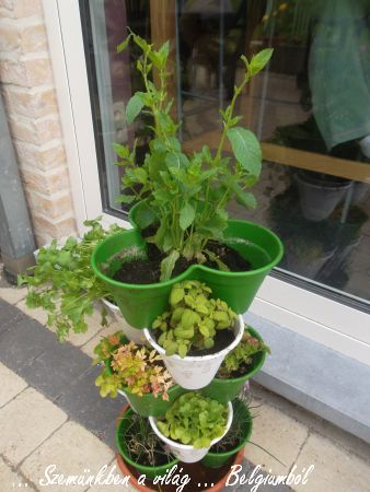 Igen, ebben az eprek voltak eddig, de azok sem érezték jól magukat. Szerintem azoknak meg ez volt kicsi hely. Hiába írták hogy jó ez meg elég ez, szerintem nem. Szépen átültettem a zöld fűszereket ebbe, a teraszajtó mellé tettem, hogy kézügyben legyen a főzéskor.