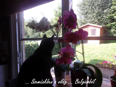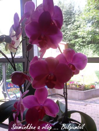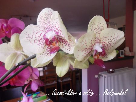 Nézzétek, kivirágzott két virágom is. Emlékszem, amikor először megláttam az orchideát itt, akkor csodálkozva néztem, hogy milyen már. Föld nélkül csak a kacskaringós gyökerei látszottak és valahogy nem is tetszett. Aztán kaptam ajándékba, meg én is vettem, és most már minden évben várom, hogy virágba boruljon. Kettő már virágzik, a harmadik is nemsokára, kettőn pedig most jönnek a hajtások, azokra még várni kell, de nézzétek ezek milyen szépek: