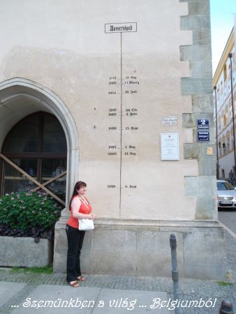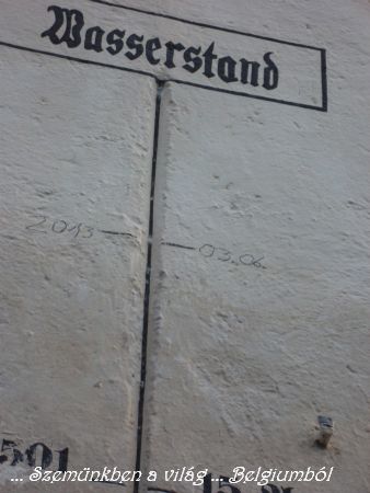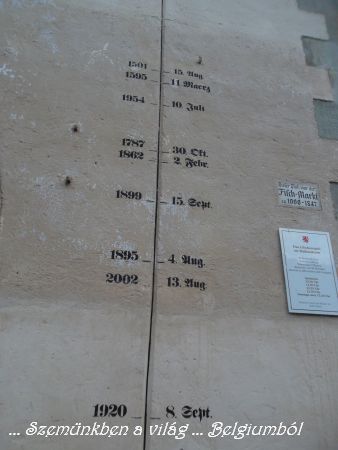 Közelebb sétáltunk, láttuk, hogy többen is nagyon fényképeznek valamit a templom falán. Hamar rájöttünk, hogy ez bizony egy vízállásjelző. Csodálkozva néztük, hogy mikor mekkora volt a vízállás, egészen 1501-ig visszamenőleg. Hogy hú, meg azt a kutya fáját, olyan hihetetlennek tűntek az adatok!