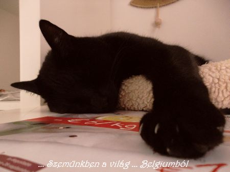 Az asztalom elég nagy, egy pici laptop van rajta csupán, így elfér az egyik sarokban egy cicaágy. Aztán hol ilyen, hol olyan színű cica alszik benne, mostanában úgy tűnik, hogy a pofozkodás után aki győz.