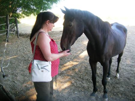Sajnos eltelt az idő, nagyon jól éreztük magunkat, de hazafelé kellett lassan vennünk az irányt. Lesétáltunk a dombról és … mint kiderült, Mahol állt ott az itatónál. Mikor meglátott, akkor elindult felém. Bevallom, egy pillanatra meg is ijedtem kicsit, hiszen lovat akkor láttam, amikor Dávidot hordtam lovagolni az itteni lovardába. Néha megsimogattam, de ennyi. Szóval Mahol szép lassan odabaktatott hozzám. 🙂 És csak nézett rám gyönyörű szemeivel, majd elkezdett óvatosan böködni az orrával. Ha kutya lett volna, akkor azt mondom, hogy szimatolt, de ugye egy sokat szenvedett gyönyörű lovacskáról beszélünk!