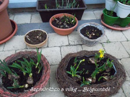 Tavaly ősszel úgy gondoltam, hogy minden gumót összeszedtem a kerti házból, mindet el is ültettem a földbe, most meg örülök nekik, mert szépen kihajtottak, virágoznak sorban. Erre most pár hete megyek a kis házba, keresek valamit és az egyik nagy tálban találtam egy rakás félig kihajtott hagymát. Nem hagyhattam ott őket, összeszedtem mindenféle cserepeket, tálakat és elültettem őket. Fogalmam sem volt, hogy lesz-e belőlük így, ilyen későn elültetve virág, de úgy látom, hogy igen. Még olyan gumót is találtam, amiről fogalmam sincs, hogy mi kel ki belőle, reméljük nem egy dinó. 🙂tavasz4