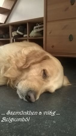 És itt egy örök baba. Biztos vagyok benne, hogy nincs tudatában annak, hogy ő egy negyvenakárhány kg-os óriási kutya. Simán beül bármelyikünk ölébe, felmászik hozzánk, bujik, hempereg. Kb. mint pici korában. Kár, hogy nem látszik a nyam-nyam a képen. Álmában is állandóan megy, szalad, nyammog, fintorog, motyog valamin. 🙂