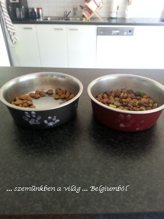 Ha valaki ropogtat, akkor mindig rohanni kell, hogy melyik tányér van fölül, ki eszik éppen? Samu nagyjából már megtanulta, hogy neki melyiket szabad enni, de Büdi eszik mindent amit lát.
