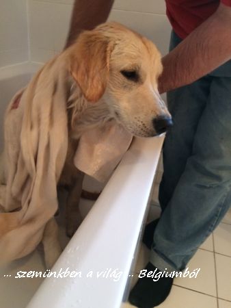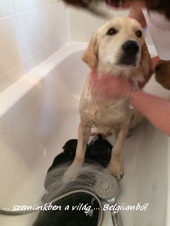 Hát, ezen is túl vagyunk, megfürdettük este a kisgyereket. Már készültünk rá jó előre, szeretnénk ha hozzászokna, eltűrné, mert bár évente nem szokás sokat fürdetni a goldikat, de azért kell, és ne legyen már harc mindig egy kis pancsi miatt.