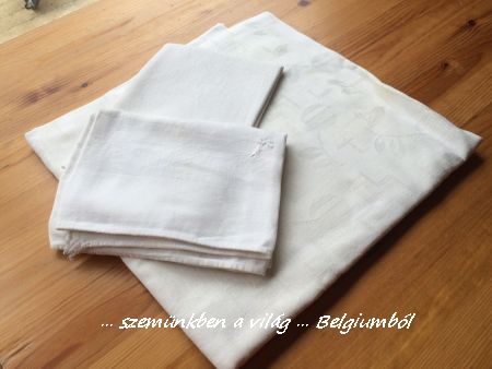 Pár damaszt terítő, két damaszt szalvéta, imitt-amott lyukas, de nem baj, értékes az a pár pici lyuk. Jeles alkalmakkor teszem fel a családi asztalra, néha kimosom, hogy megállítsam a sárgulását.