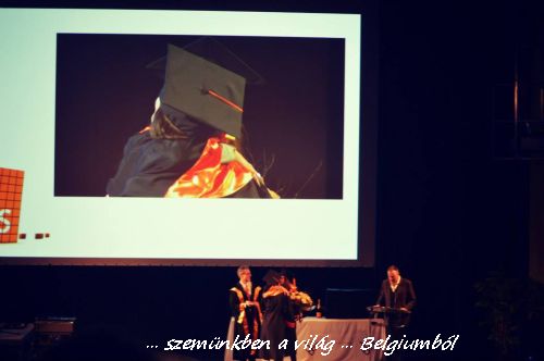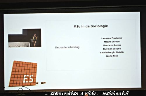 Majd a dékán azt mondta, hogy egy új dolog fog következni, ilyen még nem volt az egyetem megalakulása óta. Egy szociológus lány lépett a pódiumra és elkezdett beszélni. Elmondta, hogy van az ő karukon egy lány, Magyarországról jött sok-sok éve. Külön egy évig tanult, hogy megtanulhassa a flamand nyelvet, majd 4 év alatt megszerezte a mester diplomáját (itt megjegyezném, hogy Esztikém az 1-2. évfolyamot egy tanév alatt csinálta meg!) szociológiából. Ő a kar 2013-2014-es év második legjobb tanulója. Azt a fiatal embert akit pár perce felolvastak, hogy évfolyamelső lett nem is ismerik, mivel 6 év alatt végezte el az egyetemet. Viszont itt van a mi kislányunk, és úgy érezték, hogy ő egy olyan ember, akivel szemben ez az egész nem fair. A bizottságban azonban azt mondta a rektor, hogy ez egy bebetonozott szabály, akinek legjobb az átlaga, azé az elsőség. Ezek a fiatalok nem törődtek ebbe bele, megkérdezték mit lehetne tenni, meséltek Esztiről a rektornak. Ő azt ajánlotta, hogy minden kezdeményezés valahol elkezdődik, valami, valaki inspirálja az embereket, ha kiemelkedő emberrel, dologgal találkoznak. Alapítsanak egy új díjat, melyet kivételesen okos, intelligens személyiségek kaphatnak meg az egyetemen. Kitétel, hogy a kar összes hallgatójának bele kell mindig egyeznie. És aztán ez a fiatal lány a széksorok felé fordult, és azt mondta, az első ilyen ember az egyetem életében, akiért életre hívták ezt a kezdeményezést Mészáros Eszternek hívják. Kérték menjen ki.