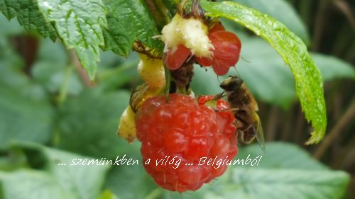 Utoljára a két kedvencem! A málna esőtől csillogó leveleit figyeltem a szélben, amikor észre vettem egy okos méhecskét, ahogy behúzódott egy málnalevél alá a vihar és eső elől: