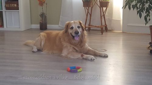 Brunó. 😀 Kis kelekótya. Félelmetes mennyire hasonlít Tasso-ra! ❤ A feje mozdulata, ahogy leül, a reakciója bizonyos dolgokra. Már nem facsarodik össze a szívem ezekre, de még felkapom a fejem, pedig lassan másfél éve, hogy itt van velünk ez a kis rosszcsont. Gyuszi vezérigazgató úrnak hívja. Jön-megy, intézkedik, ellenőriz, megnéz. A személyes tér fogalmáról fogalma sincs sem a többi kutyival, sem emberrel kapcsolatban. Egyszerűen belemászik az emberbe, hogy na, megérkeztem, itt vagyok, cukizok neked, csóválom a farkincámat te pedig szeress. ❤ A dumálás nála is megy, többet beszél mint Taszika beszélt, de kevesebbet mint a goldik. Nála a farkinca és a szeme ami beszédes, abból veszem le mit szeretne.
