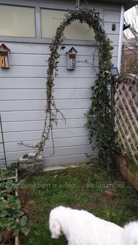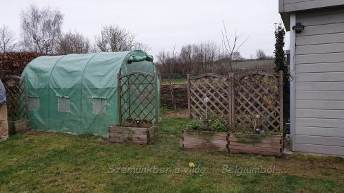 A virágtartók is ujra a helyükön és az ideiglenes kertkapu is, most már nincs járkálás a kertben. Azért még Sam egy óvatlan pillanatban besettenkedett és befeküdt a fólia alá. Mert ott volt a legjobb, a felásott földön, hogy a szél se érje a kis okos buksiját. Itt meg alább a főnök úr, Brunóka ellenőrzi éppen a munkálatokat. 🙂