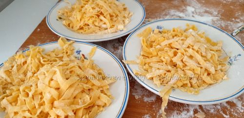 Mami mindig a tojások súlyát vette alapul, ahhoz ugyanannyi lisztet tett alapnak és azt egészítette ki amennyit még felvett a tészta, hogy nyújtható legyen. No de a gm lisztek még véletlenül sem viselkednek úgy ahogy a normál liszt, így tudtam ez a mai érdekes főzés lesz. Végül meglett minden. Még ki kell a fiukat tennem pár próbának mire tökéletes lesz 🙂 , és más lisztből is megpróbálom, bár ezt direkt tésztának vettem, de így nagyon drága. A következő a rizsliszt lesz és aztán még van pár ötletem. Pár gyúrás, nyújtás után már tudni fogom melyik lesz a mi tésztánk. 🙂