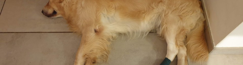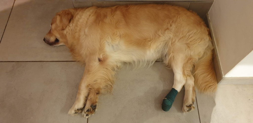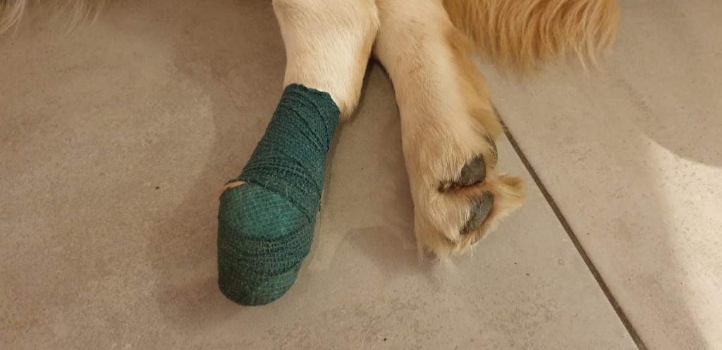 Gyuszinak szóltam, szaladjon gyorsan. Láttuk, hogy a hátsó tappancsa vérzik. Próbáltuk letisztítani, hogy lássuk mi történt. Bekötöttem neki, de szinte azonnal átázott. 😦 Mikor Gyuszi leszedte a kötést akkor látta, hogy az egyik körme fityeg a levegőben. Szólt is azonnal, orvost kell keresnünk.