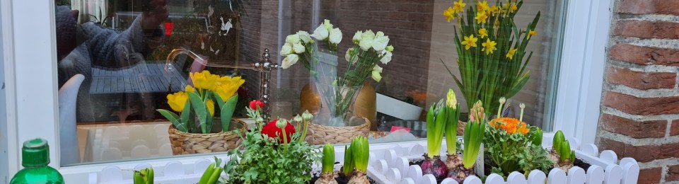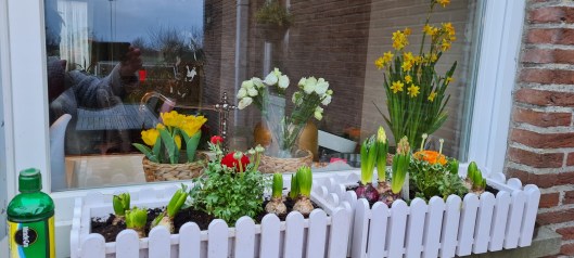 Virágok kint is, bent is.
