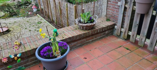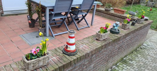 Gyuszi már kihozta a székeket. Jövő héten még nem, de talán utána már lesz olyan kellemes meleg, hogy kiülhetünk. Addig csak a kis virágok várják a jó időt.